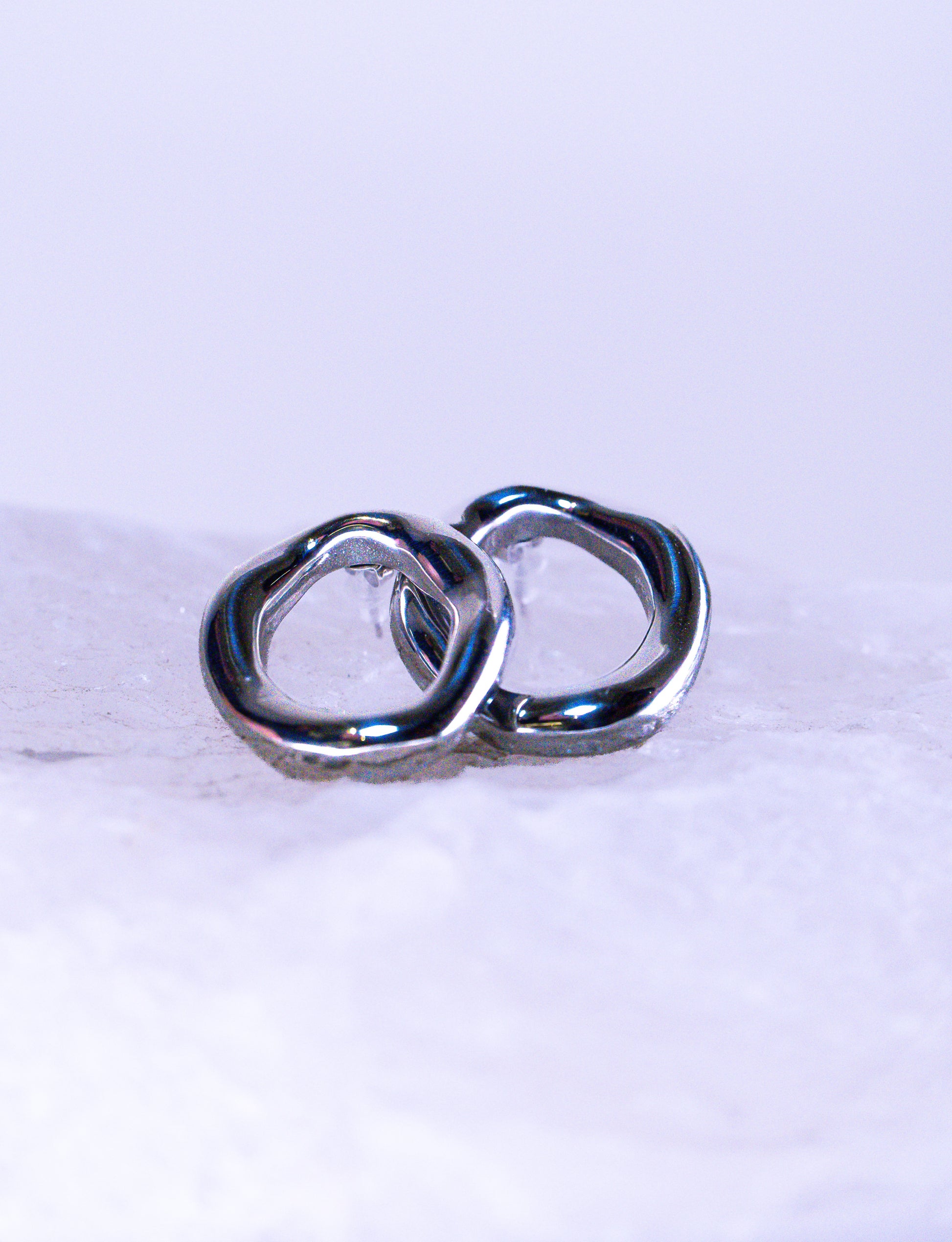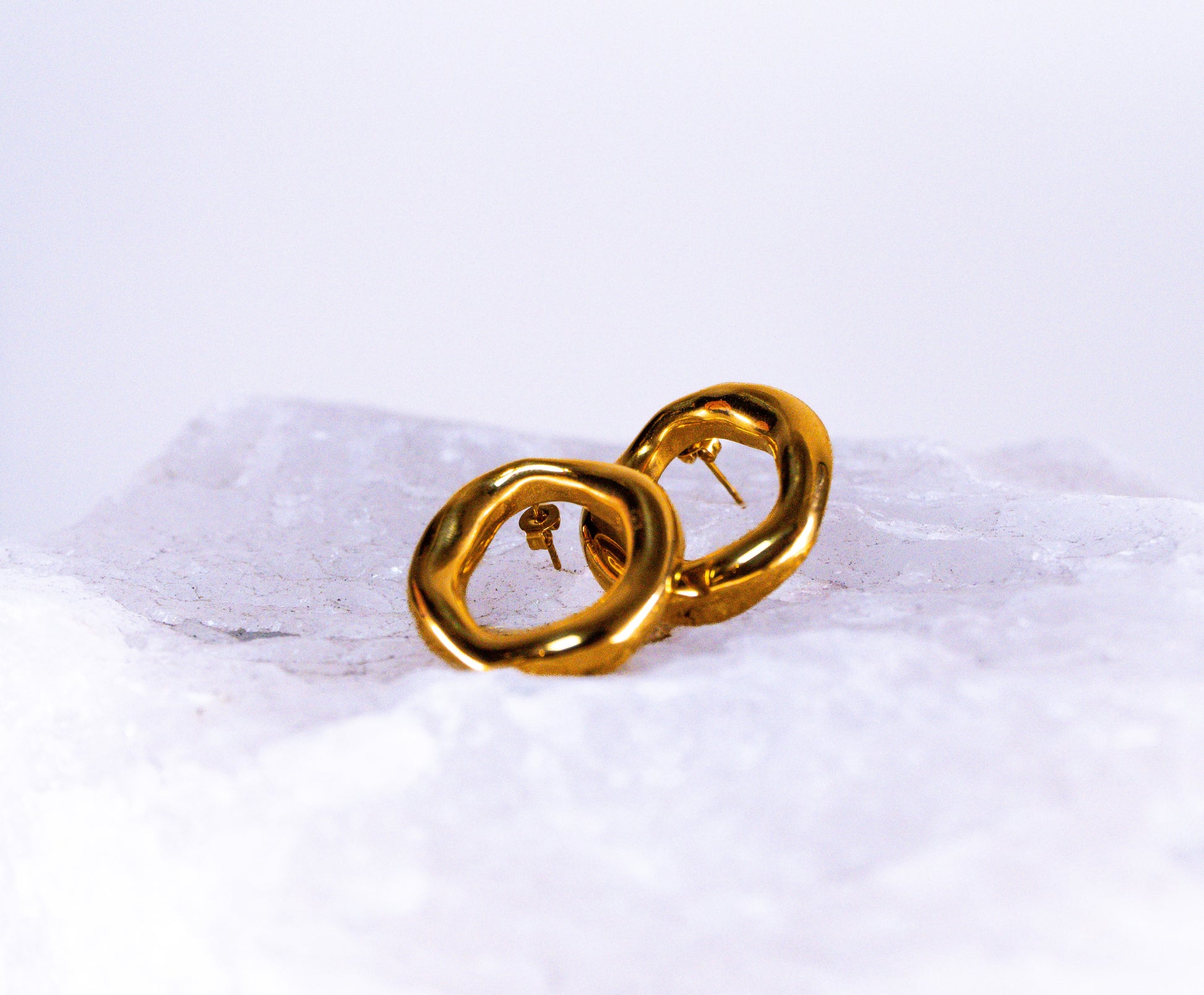 Aros redondos de acero quirúrgico 316L con baño PVD en oro. Diseño irregular y texturizado que refleja la naturalidad de la arena bajo el sol. Livianos, hipoalergénicos y perfectos para el día a día.