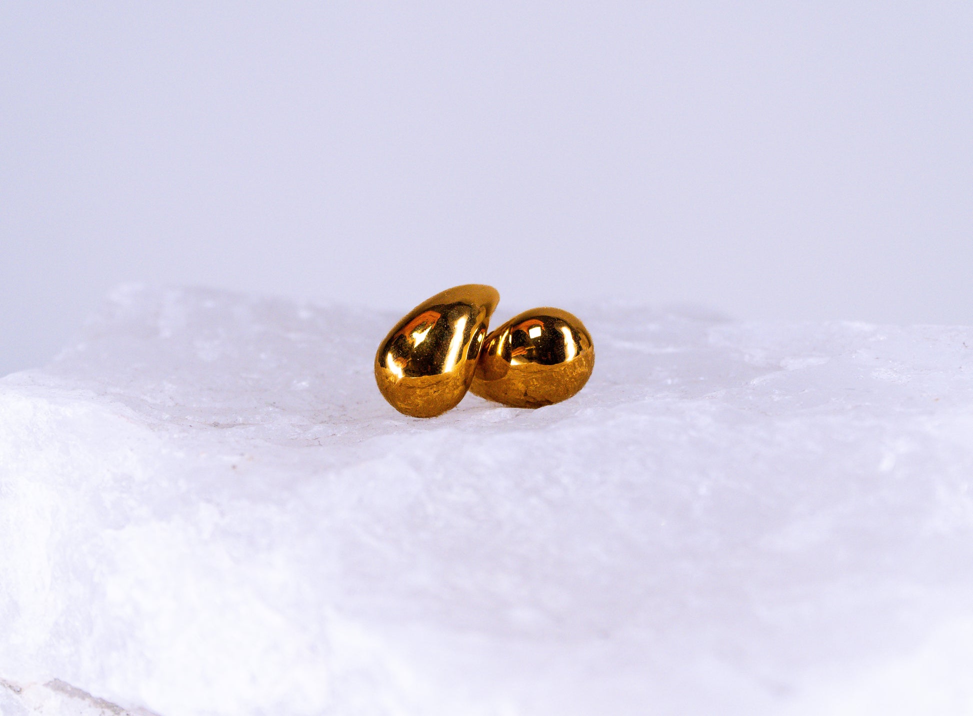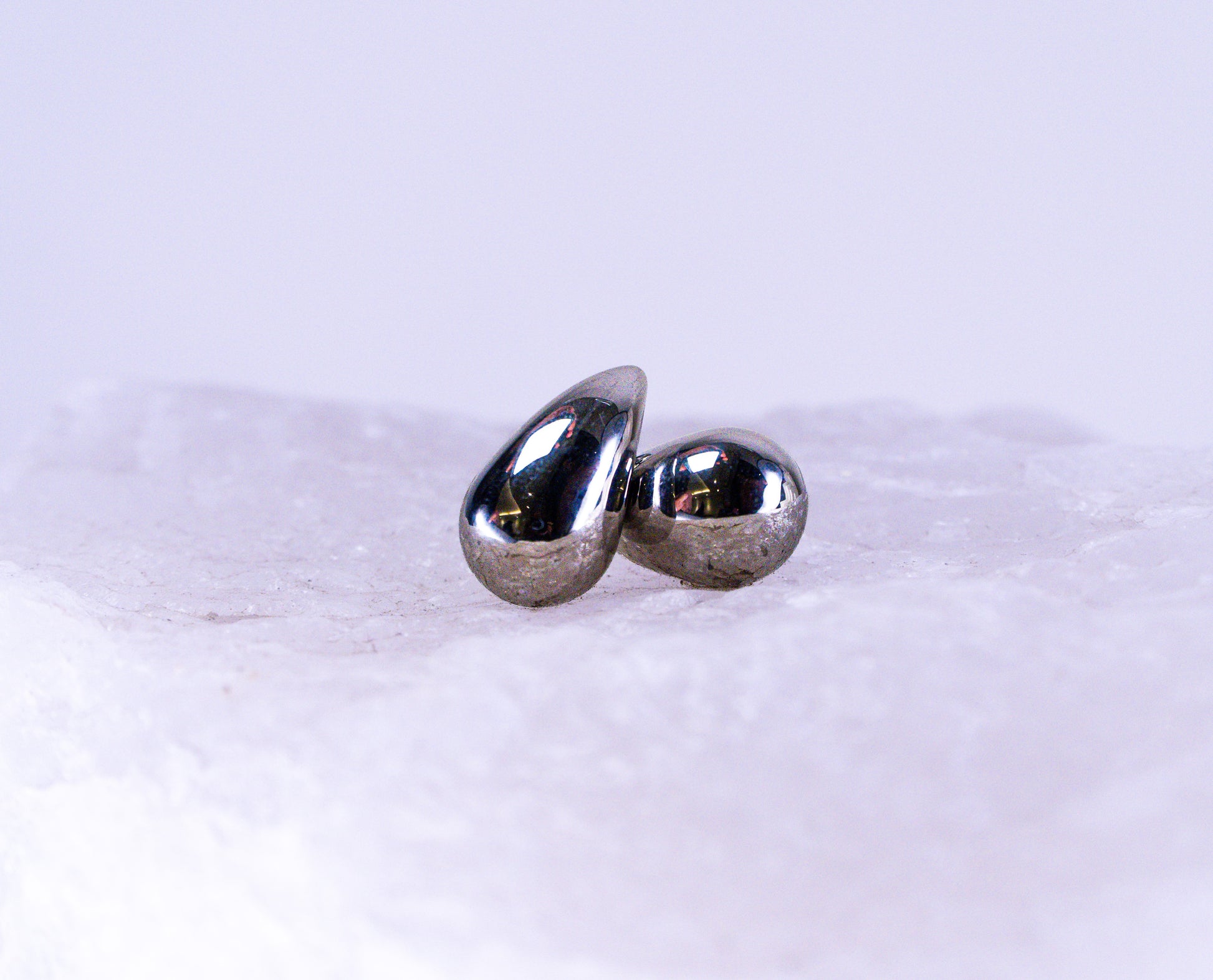 Aros de acero quirúrgico 316L con forma de gotas pulidas en tono plateado. Inspirados en la frescura del mar, son resistentes al agua, hipoalergénicos y atemporales.
