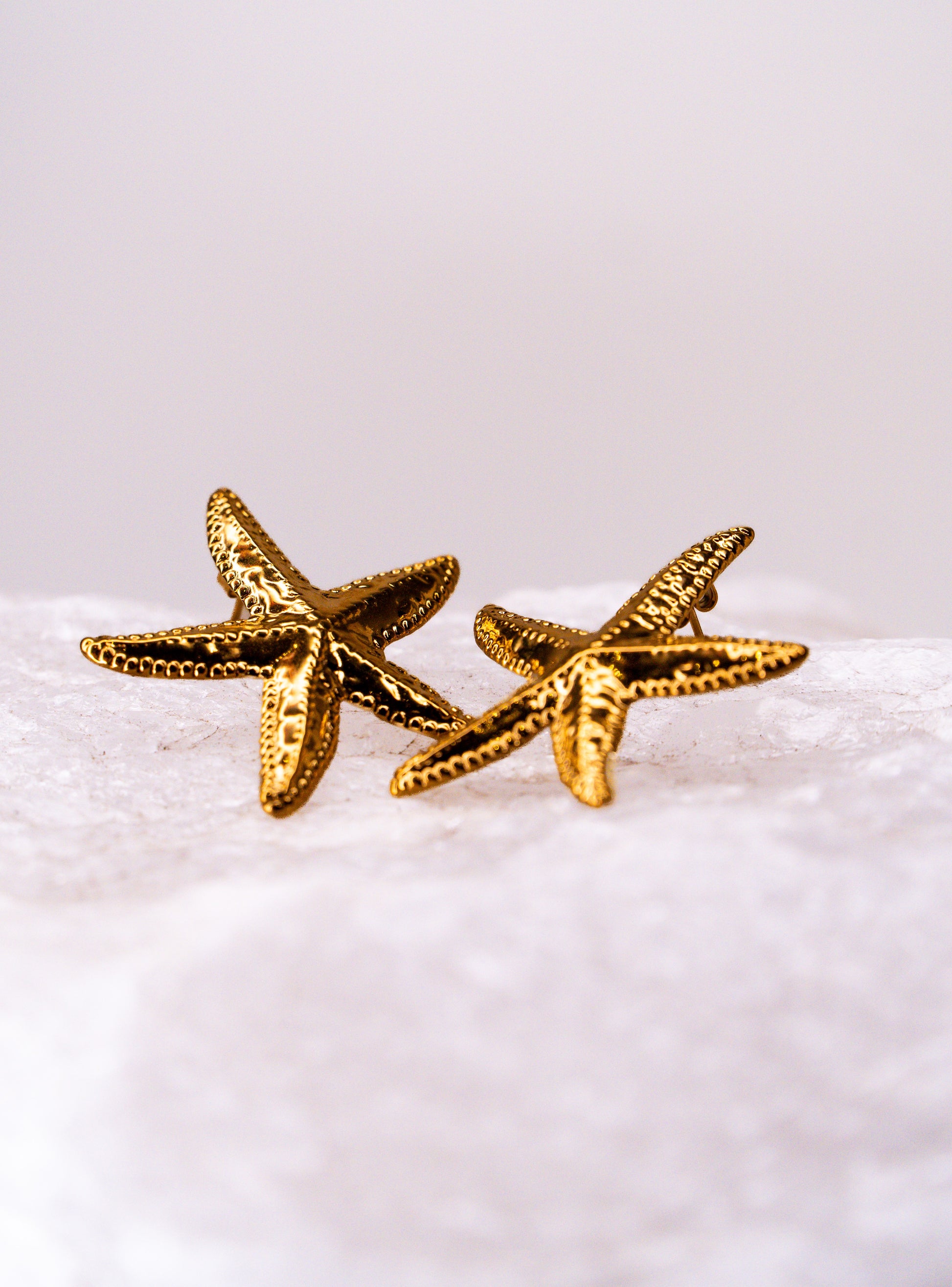 Aros en forma de estrella de mar, bañados en oro PVD sobre acero quirúrgico 316L. Inspirados en la playa y el océano, son hipoalergénicos, resistentes al agua y perfectos para un look veraniego y fresco.